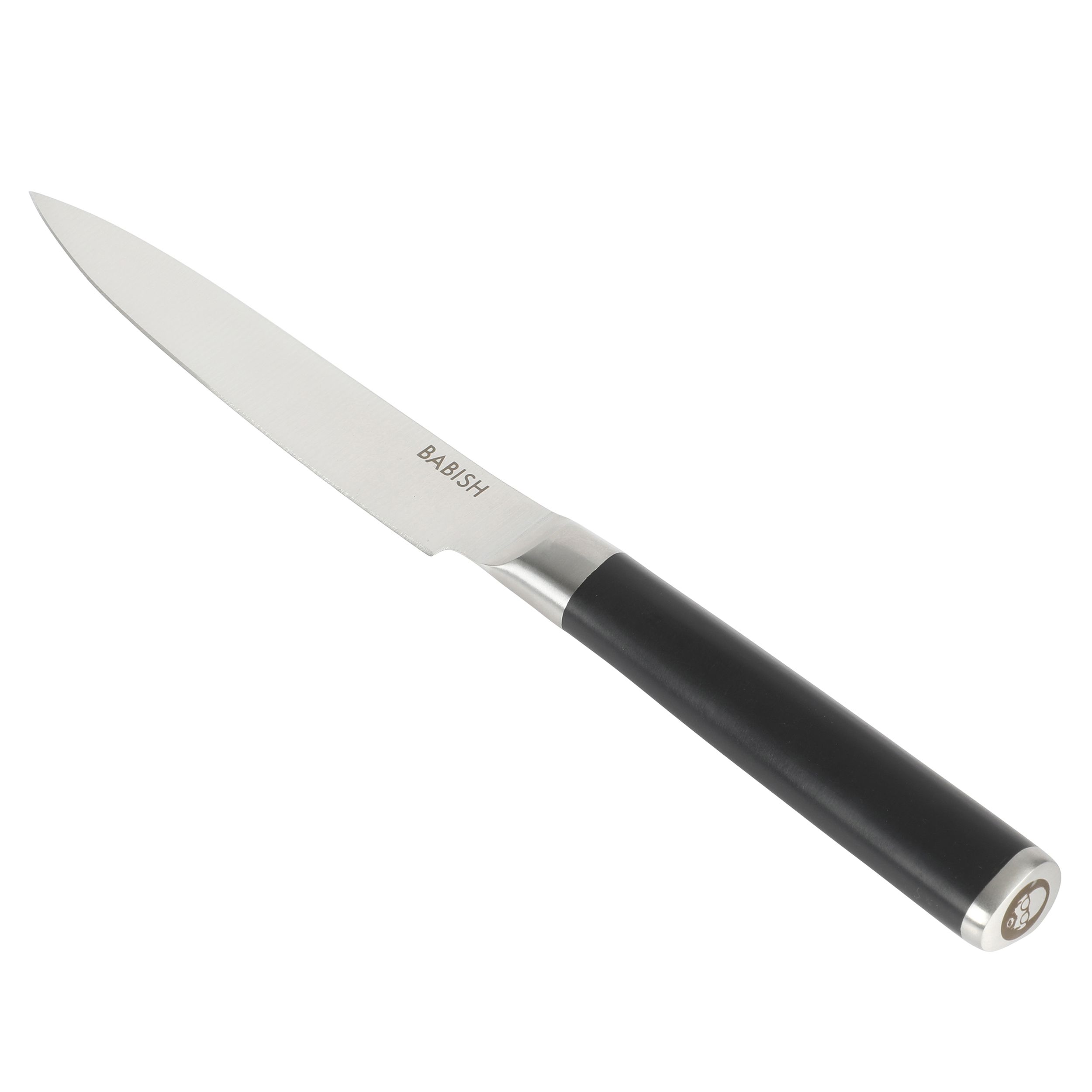 A practical go-to knife for the home cook, the Babish 5-inch German Steel Utility Knife prepares ingredients in easy and precise cuts. Constructed from high-carbon, 1.4116 German steel, this nimble knife features a forged, full-tang blade to offer ultimate precision and sharpness. The double-bolstered handle provides strength and balance when cutting, chopping, peeling, and more. Perfect for everyday use, this precision-forged knife is easy to manuever, clean, and maintain. Hand wash only. Towel dry immediately.
