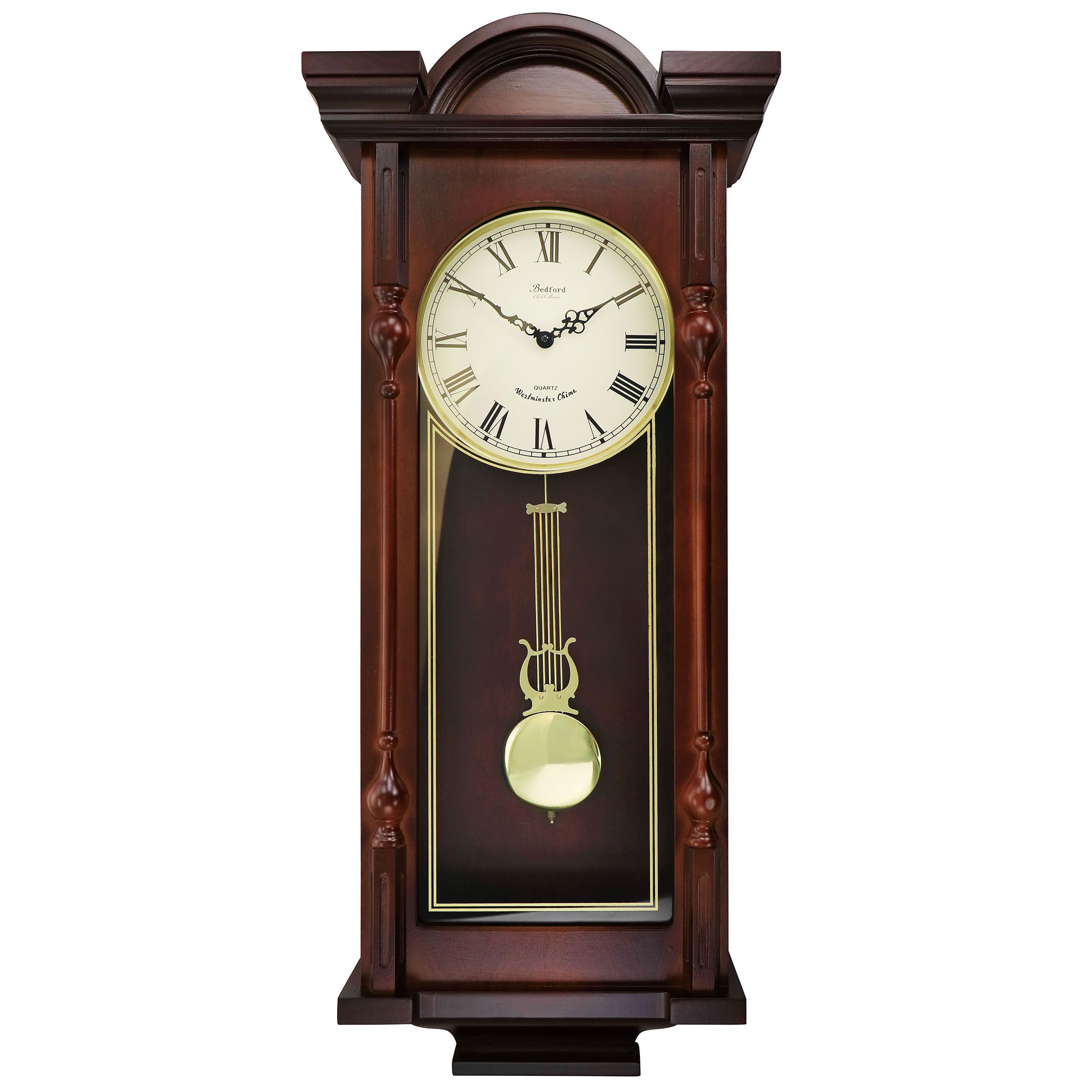 Bedford Clock Collection offers you the elegance and beauty of classic style with the modern reliable technology of today’s wall clocks. Whether a gift to your self or for someone else, this clock will add a special touch of sophistication to any room. With its stunning Cherry Oak finish, Golden Accents and Swinging Pendulum, this wall mountable time piece is not only an attractive focal point, but a functional and reliable piece of technology. With 4 distinct Chimes, the clock will announce the beginning of each new hour for your convenience. Carved details and special touches through out , as well as a convenient Sleep Mode that provides you with the option to pause the melodic chimes of this beautiful time piece for an entire 12 hour period with a simple push of your finger.
