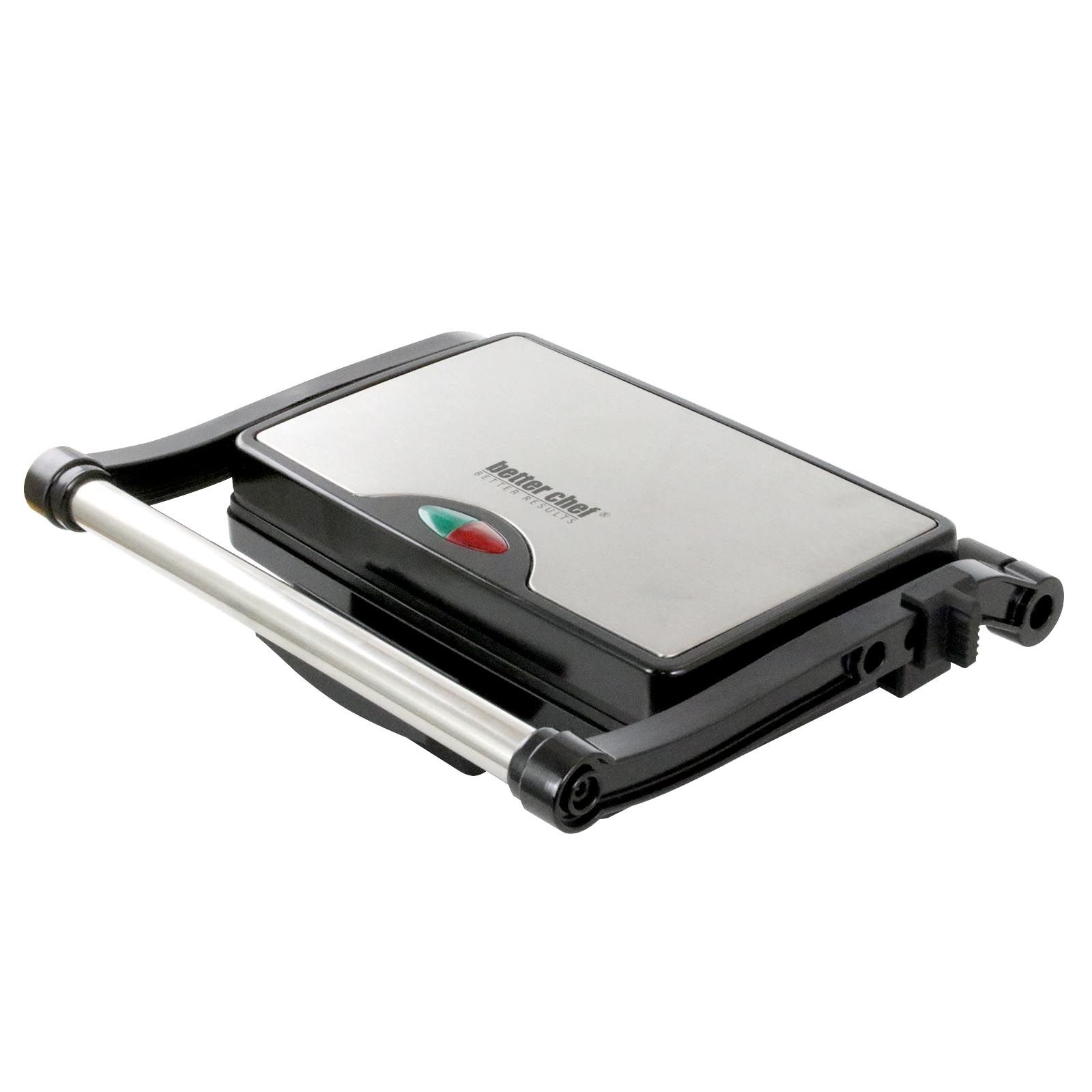 The Better Chef Stainless Steel Panini Press Gourmet Sandwich Maker gives you the power to make restaurant style sandwiches. Go big or go home, customize your sandwich from over stuffed Paninis to a simple grilled cheese. This versatile press doesn’t just make sandwiches, evenly cook chicken and burgers in a hot minute! Clean up with ease, thanks to the convenient nonstick surface. With a sleek black and stainless steel design, this sandwich maker looks great in any kitchen space.