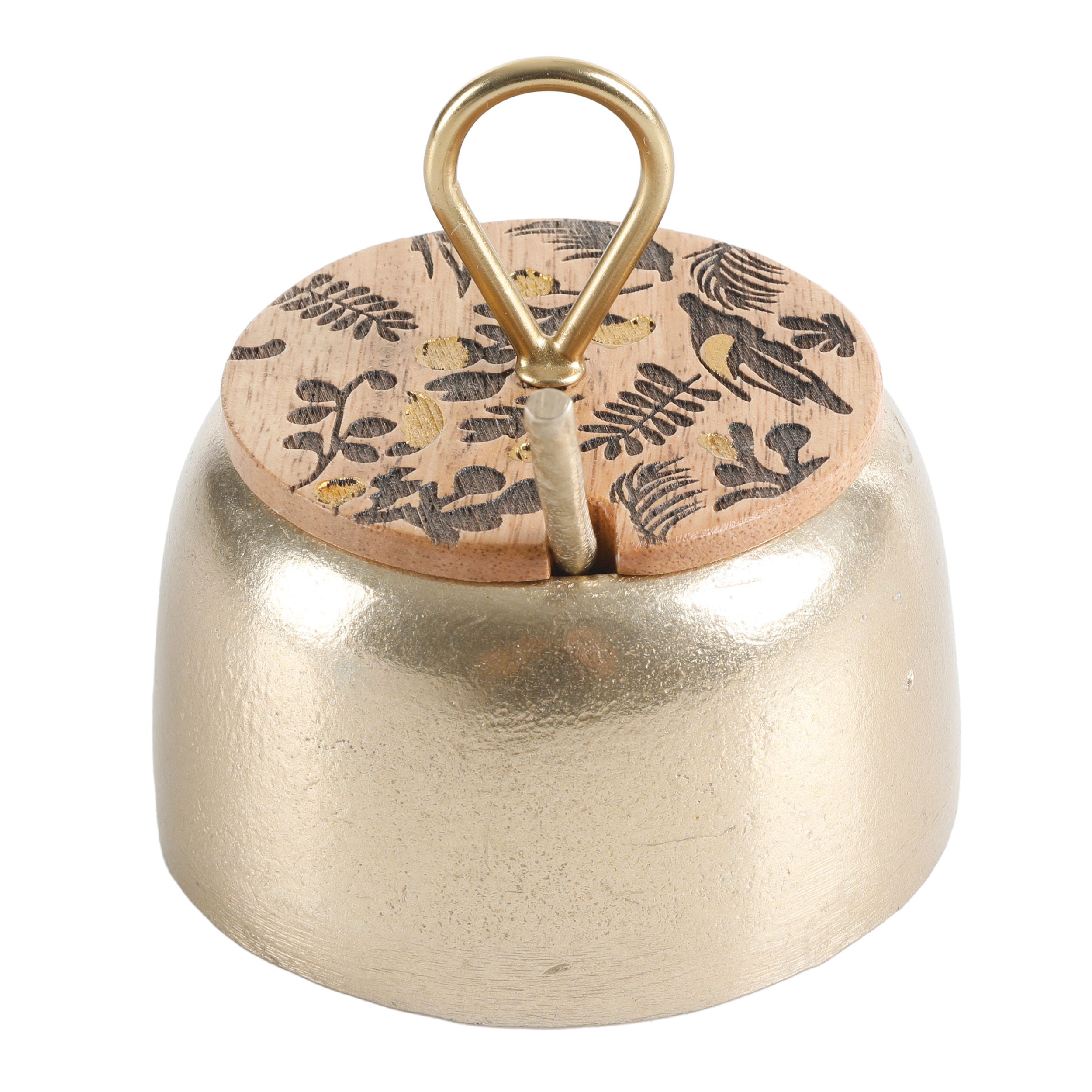 The Cravings By Chrissy Teigen 4 Inch Aluminum Spice Cellar and Spoon with Mango Wood Lid is the perfect accent to any kitchen table. This condiment server features a gold aluminum body with a small metal spoon. The mango wood lid with its spoon opening features a natural touch to the full design. Hand wash the spice jar and wipe clean the wood lid for proper care. This dazzling container is great for storing chili flakes, brown sugar, course salt, or more.