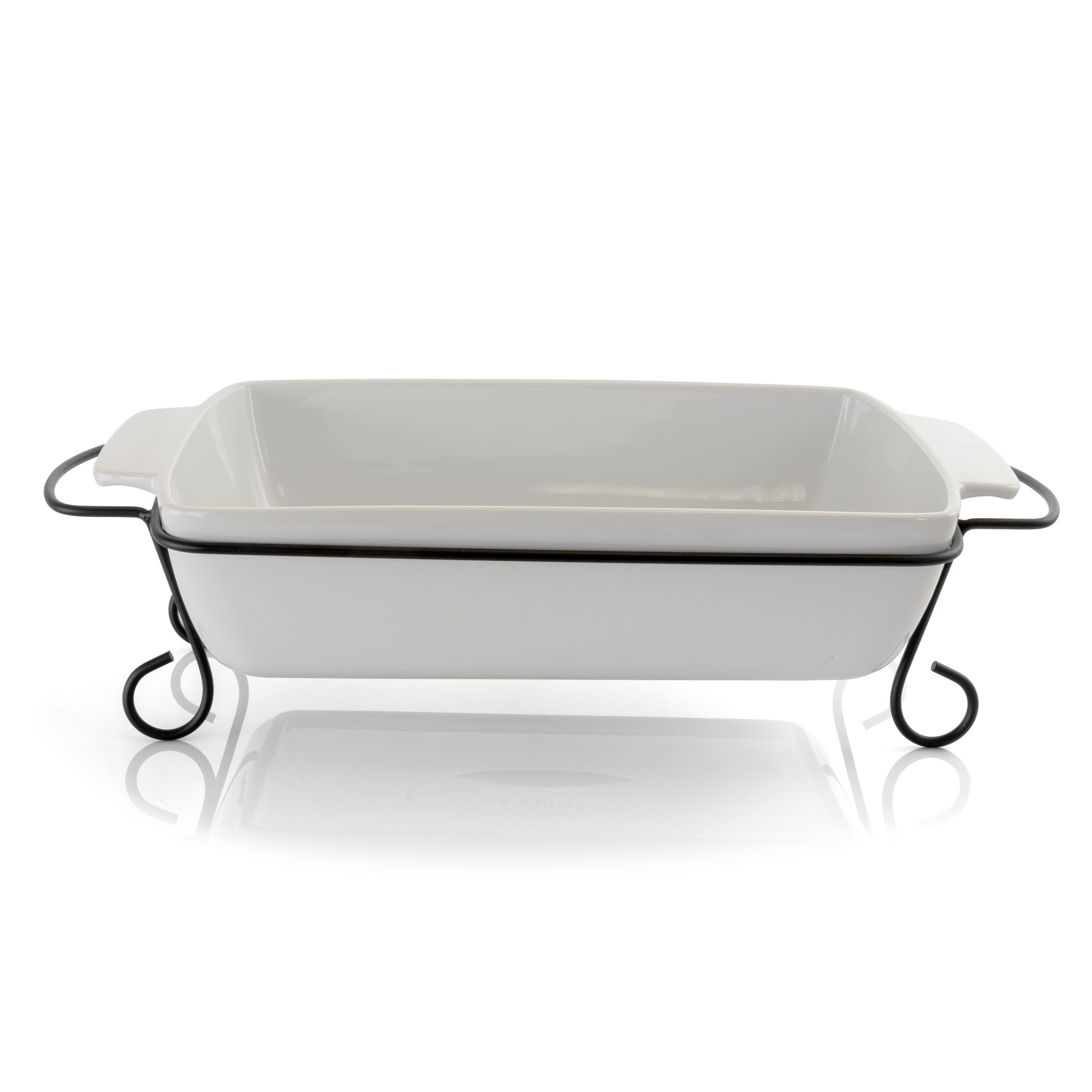 Manufacturer: Gibson Elite UPC: 085081475725 Model Number: 124391.02 The Gibson Elite 2 piece 15.5 inch stoneware bakeware with metal rack really puts the feast together. This 2 piece serving set features a rectangle bakeware container made of stoneware. Its oven safe so you can cooking and directly bring it from the oven to the dinning table. Display your wonderful meal with the matte black metal rack that keeps the heat away from the table’s surface. Serve just about anything you can think of, from peach cobblers and apple strudels to baked tilapia and stuffed chicken breasts. Perfect for any large gatherings, use it to display a side dish or show off the main course! Weight: 8.00