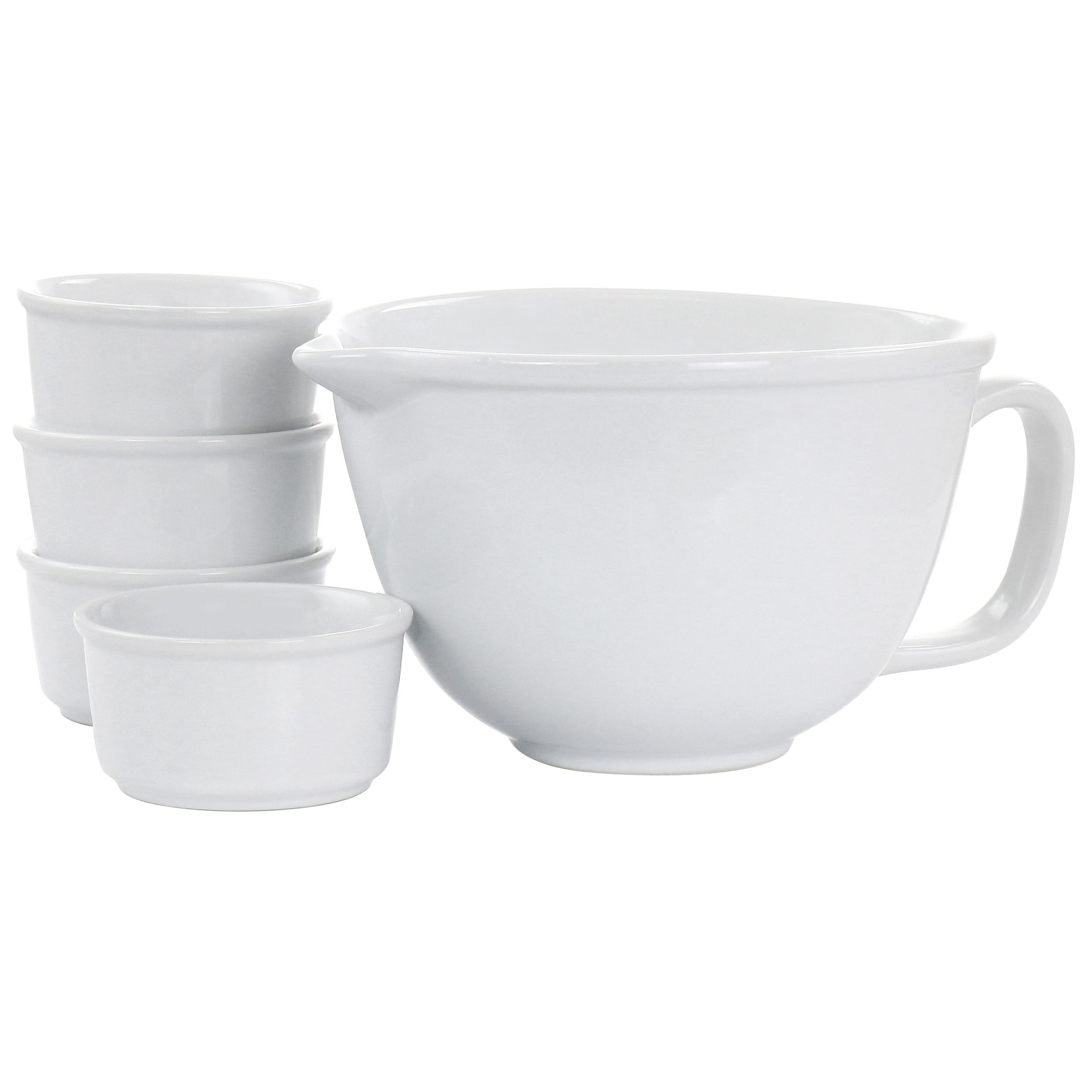 Manufacturer: GIbson Elite UPC: 085081548498 Model Number: 131668.05 Part of the Gracious Dining Collection by Gibson Elite, this 5 piece Bakers set is sleek and modern and will go nicely with most kitchen decor. Sophisticated style that brings character and richness to the table, blending seamlessly with a wide array of colors and motifs. This set includes one 2qt batter bowl and 4-8oz matching ramekins. Bake custards, cakes, flans, and a variety of other individual serving dishes with this set and enjoy without having to transfer to a plate! Ramekins are oven, microwave safe, and dishwasher safe; batter bowl is dishwasher and microwave safe. Weight: 8.00
