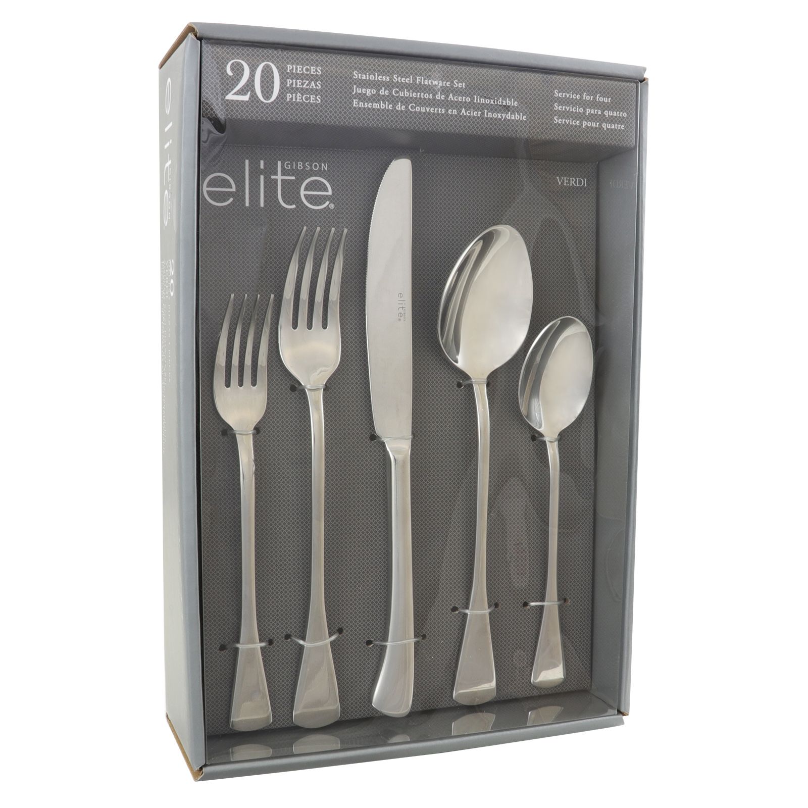 Manufacturer: Gibson Elite UPC: 085081174086 Model Number: 94227.2 The Monteverdi Flatware Set by Gibson Elite features a popular design boasting an elegant satin finish. The handles delicately flare out at the end, creating a well balanced flatware set. This beautiful set is well suited for virtually any table decor. It will heighten the level of sophistication of your table setting; perfect for everyday use and more formal occasions.