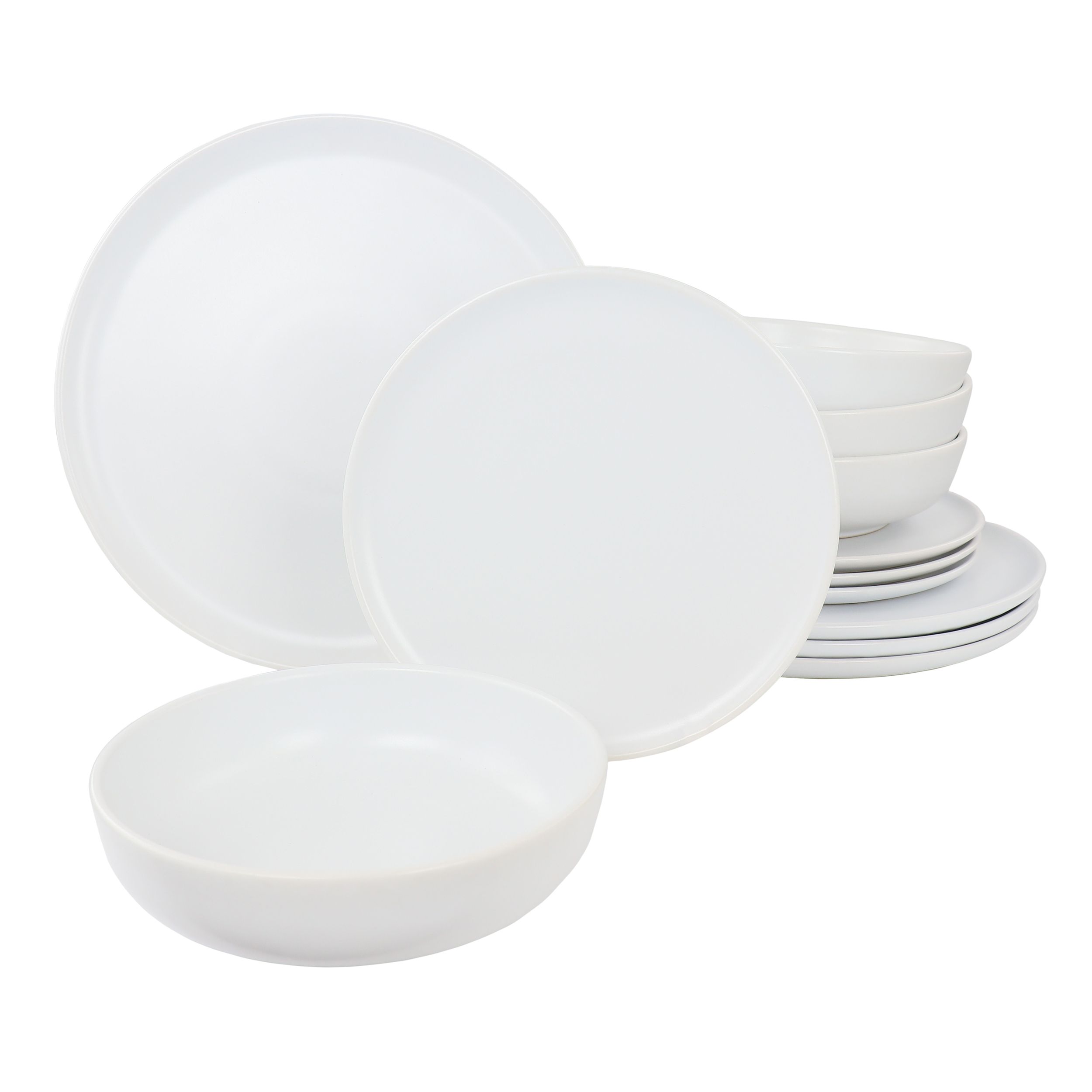 Bring your dining room together with this Gibson Elite Serenade 12 Piece Round Stoneware Dinner Set. The matte glaze coating gives this set a sleek look and the simplistic white color makes this a minimalist masterpiece. With 4 large dinner plates, 4 dessert plates, and 4 bowls, you have everything you need for a cozy night in. Food prep and clean up is also super easy as these dishes are microwave and dishwasher safe.