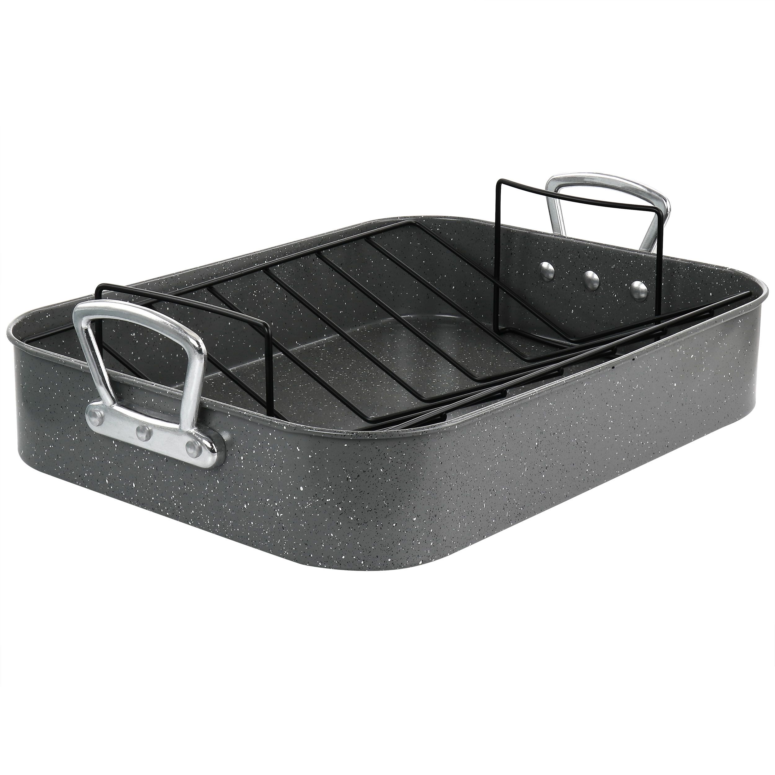 The 2 piece turkey roster set by Gibson is the perfect solution for holiday and special occasion meals. This large 16.25in pan will fit turkeys, chickens, and large one pan meals. The lightweight carbon steel construction makes this pan and wire rack combination easy to move from counter to oven to table. Wire rack leaves room for meat juices to flow to the bottom while keeping your meat cooking evenly and achieving that perfect crisp from top to bottom. Large stainless steel integrated handles for a sturdy grip. Speckled grey pan design.