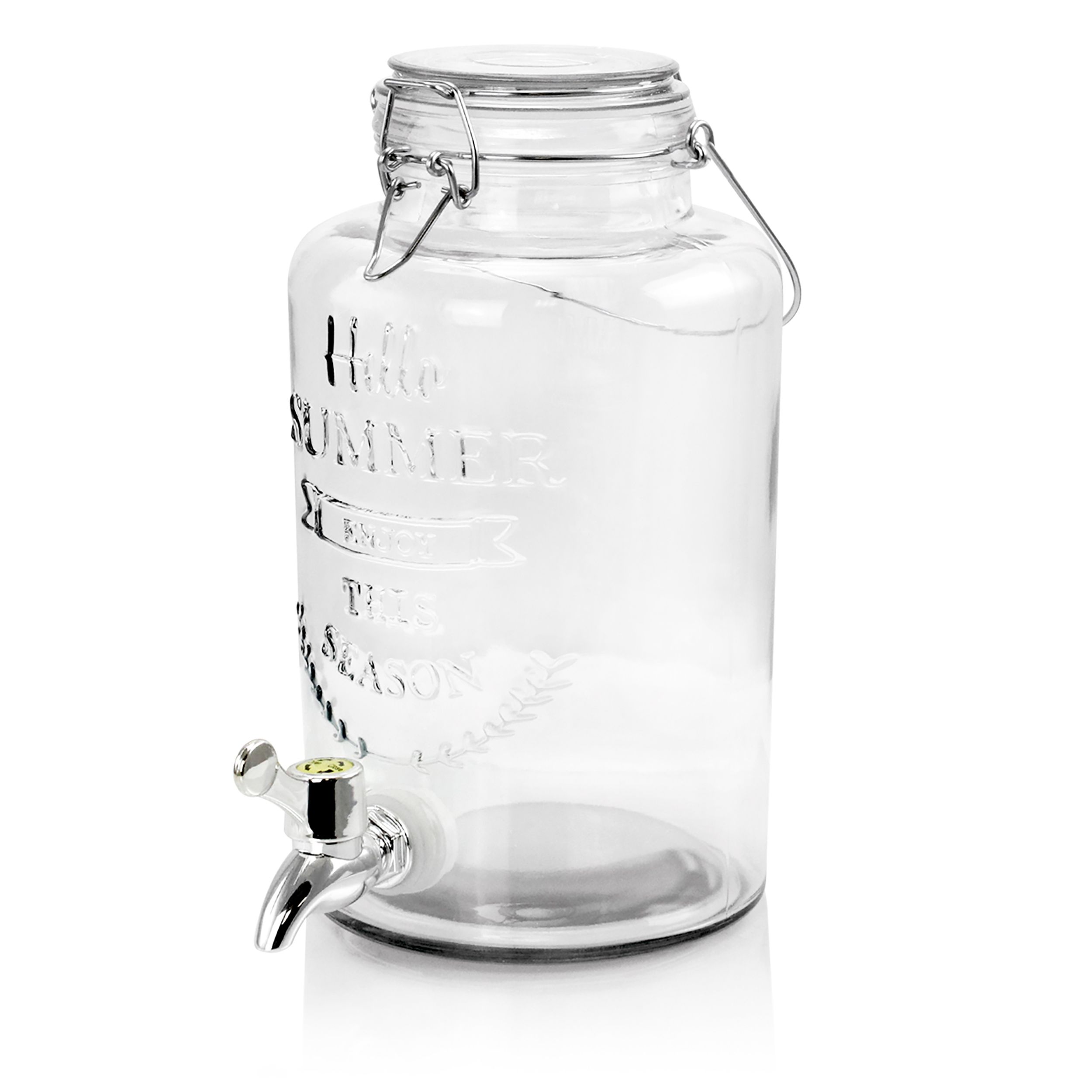 Manufacturer: Gibson Home UPC: 085081474193 Model Number: 124238.01 The Gibson Home Bayfront Summer 2.5L Mason Jar Glass Beverage Dispenser is the perfect kitchen accessory for fresh, cool drinks. This set features a glass mason jar container with a wire bail and trigger closure. The wire handle makes for easy transport and the spout allows for easy one-touch dispensing. Weight: 5.30