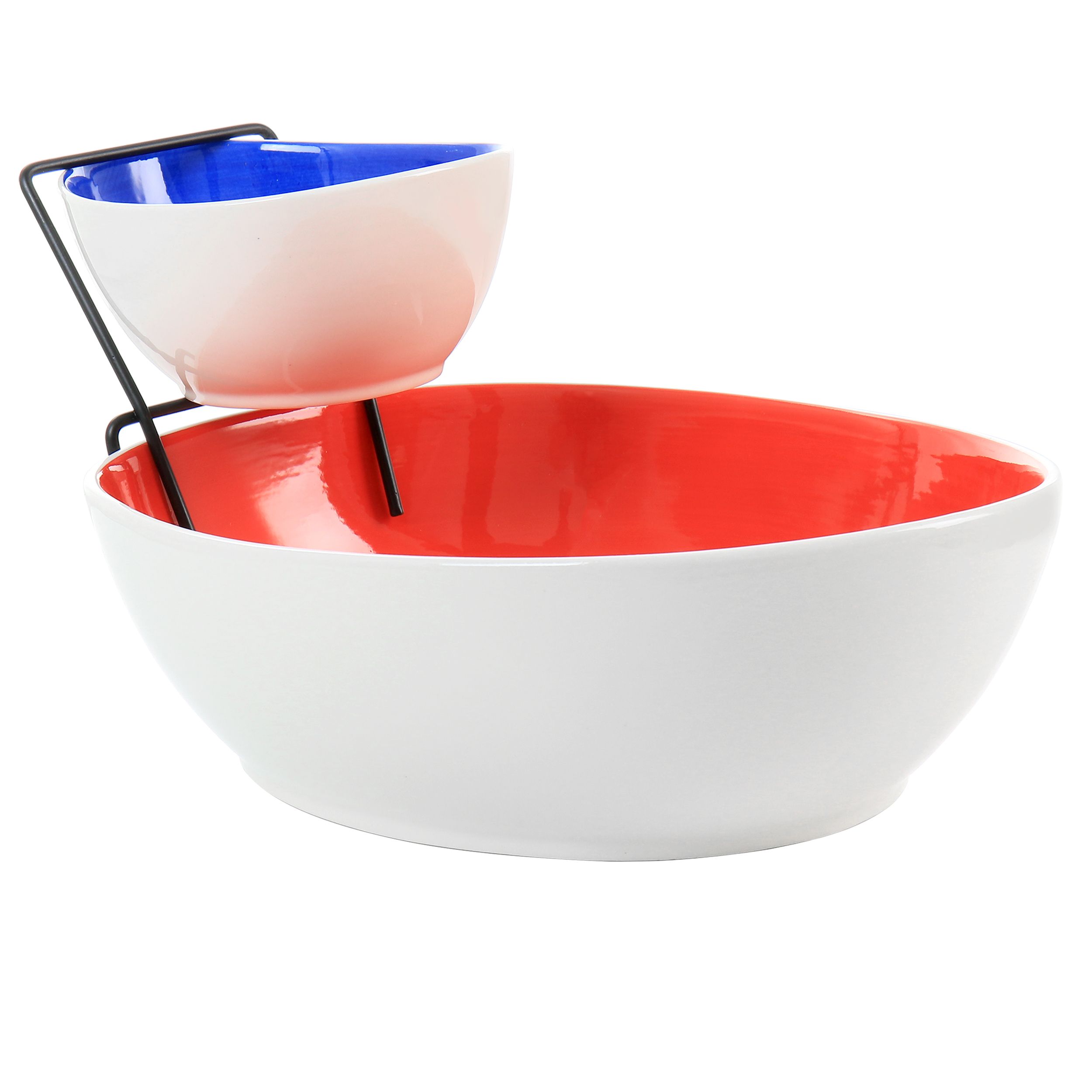 Gibson Home Crenshaw 3 Piece Hand Painted Stoneware Chip and Dip Set with Metal Rack