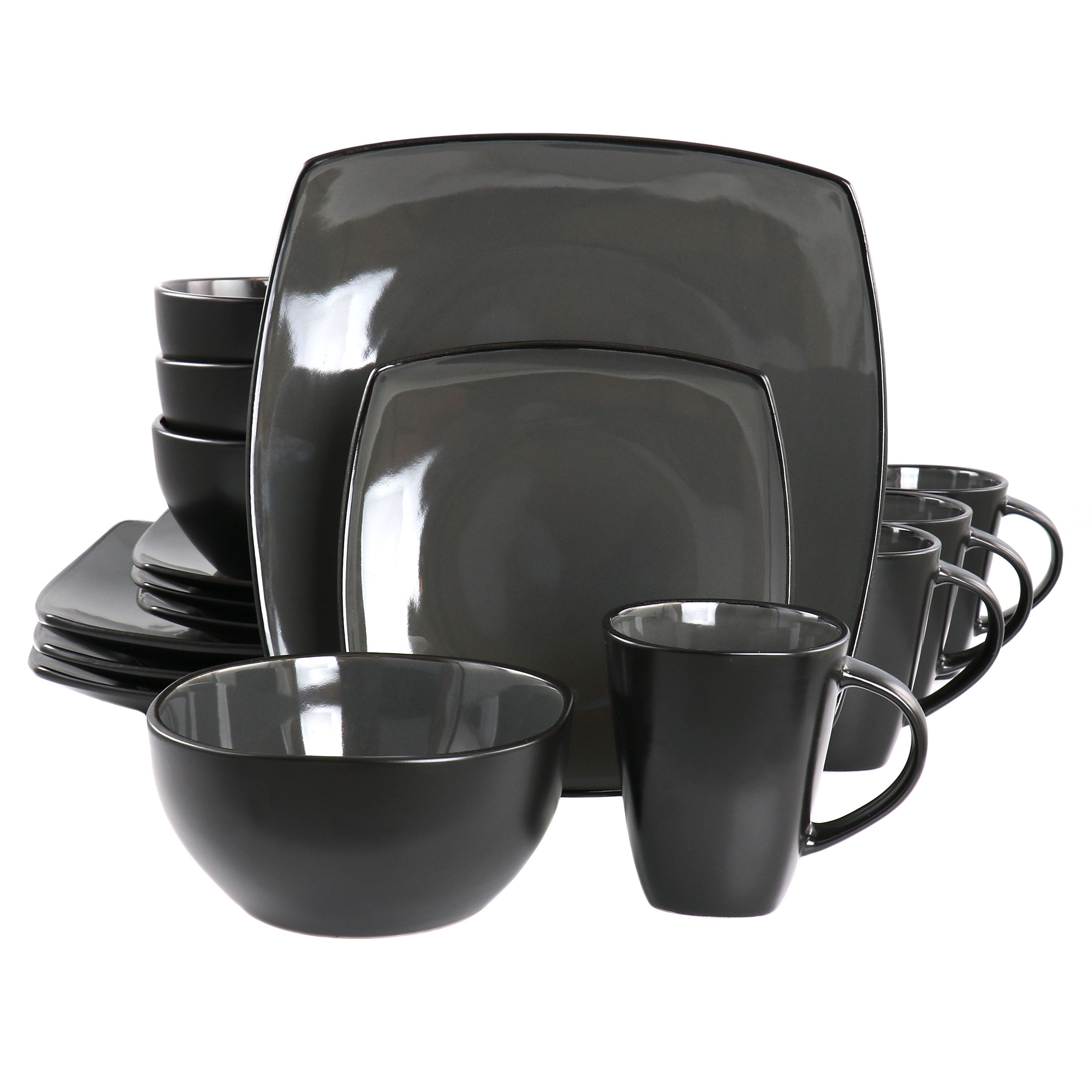 Manufacturer: Gibson Home UPC: 085081147127 Model Number: 91531.16 Set the table for a delicious dinner on this Gibson Home Soho Lounge 16 Piece Square Stoneware Dinnerware Set. In this set, you have everything you need for a meal including four of each dinner plates, dessert plates, bowls, and mugs. Each dish has soft square edges giving them a unique and modern look. The top side of the dish is a glossy cool grey with a matte black exterior, a sleek and stylish look fit for any table. This dinnerware set is dishwasher and microwave safe making for convenient everyday use. Weight: 25.00