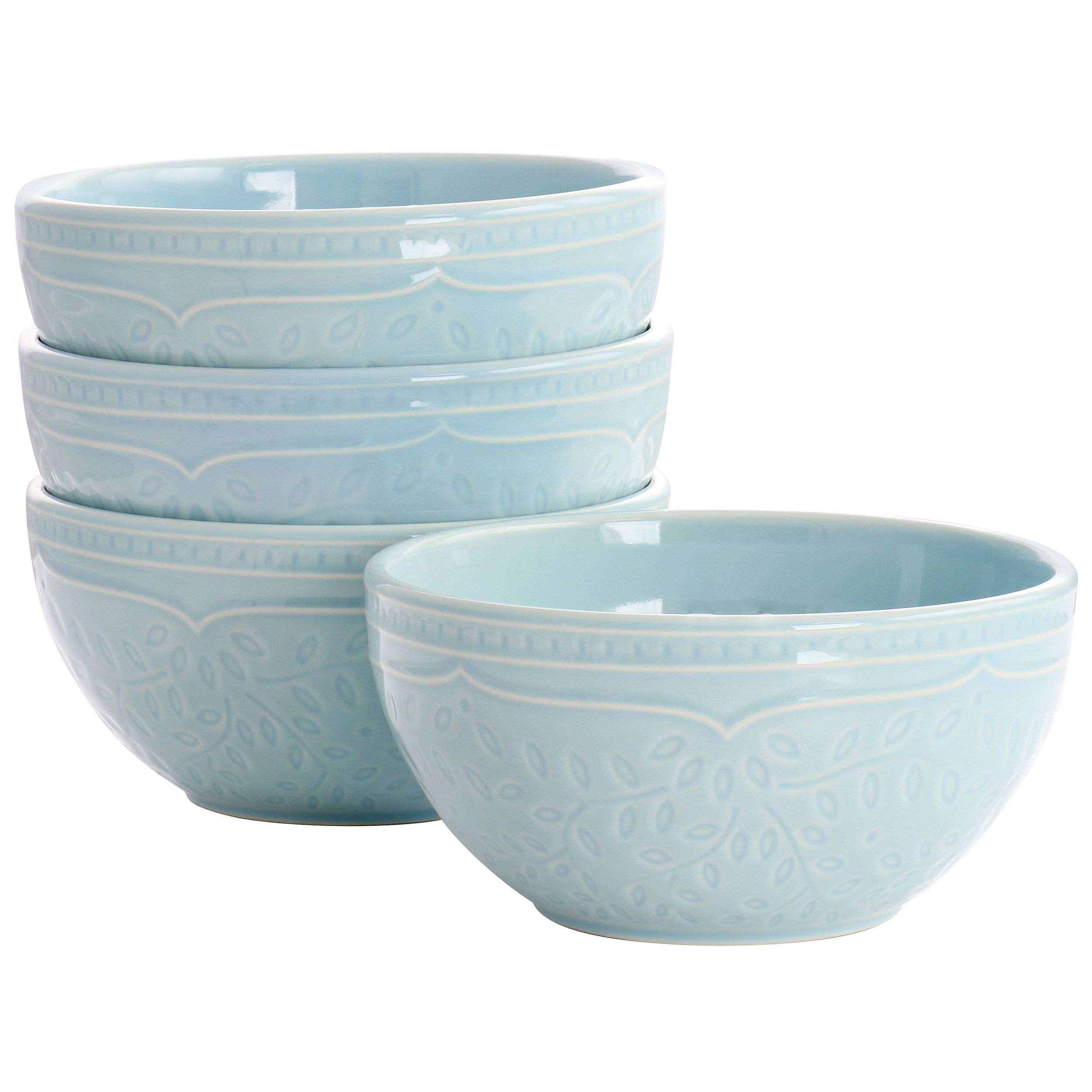 Add a subtle touch of print and color to your every day dining with this Alemany Stoneware 4 Piece Bowl Set by Hometrends. Each bowl in this set is adorned with embossed floral designs that add texture and a little something special without being too bold. The soft baby blue glossy finish is the perfect shade to add some color to your table while still being able to complement your simple white dishware. These bowls are constructed of sturdy stoneware material that is dishwasher and microwave safe for long lasting use. You can’t go wrong with this bowl set!