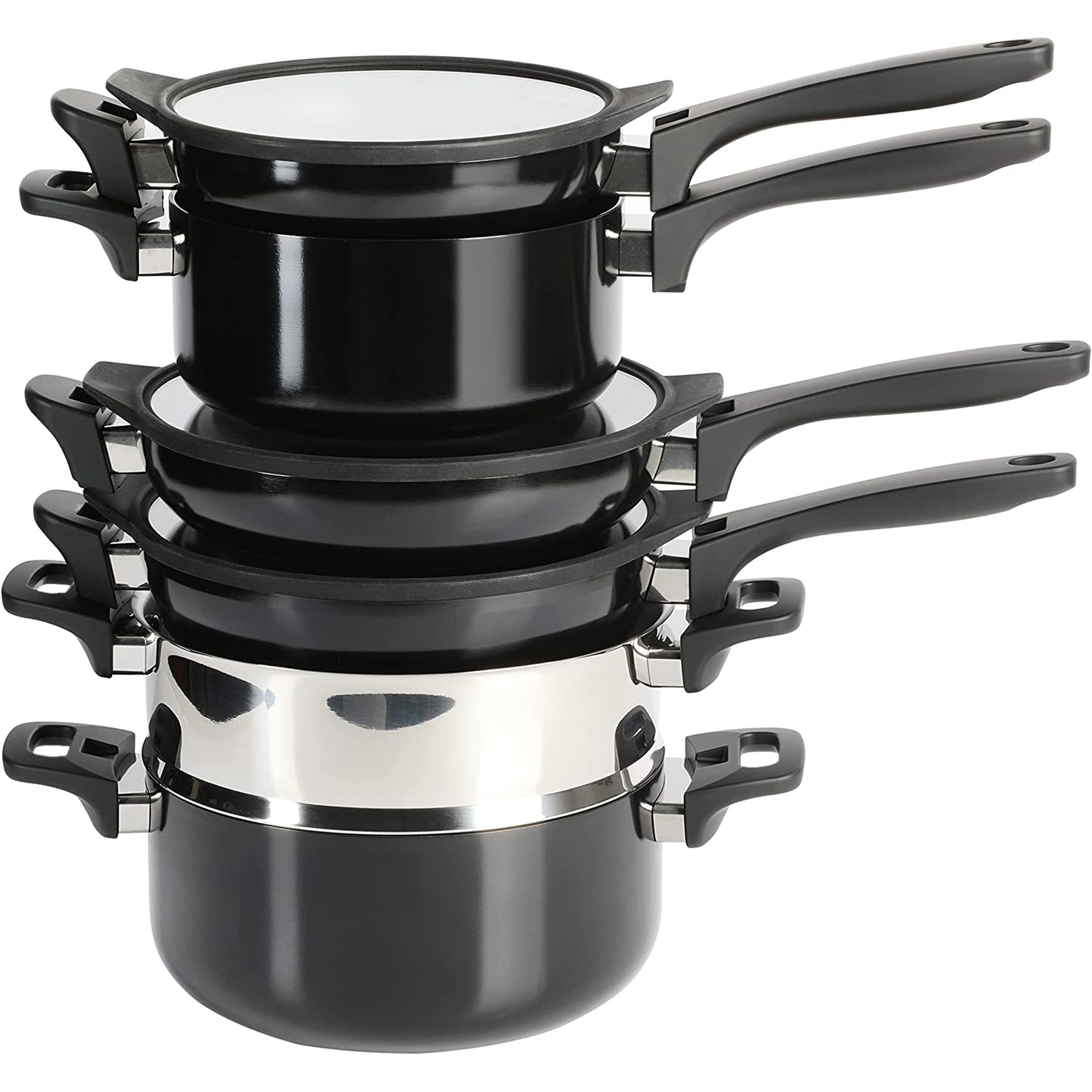 Manufacturer: Kenmore Elite UPC: 85081060938 Model Number: 82912.09 Complete your kitchen cookware collection with the Kenmore Elite Grayson 9 Piece Nonstick Aluminum Stackable Cookware Set. Its unique nestable design makes it easier to store everything together. Heavy gauge aluminum bodies provide even heating while the nonstick coating releases food from the cooking surface with ease. Cook a multitude of dishes from sauted meats and steamed veggies, to soups and fried delectables. Weight: 22.00