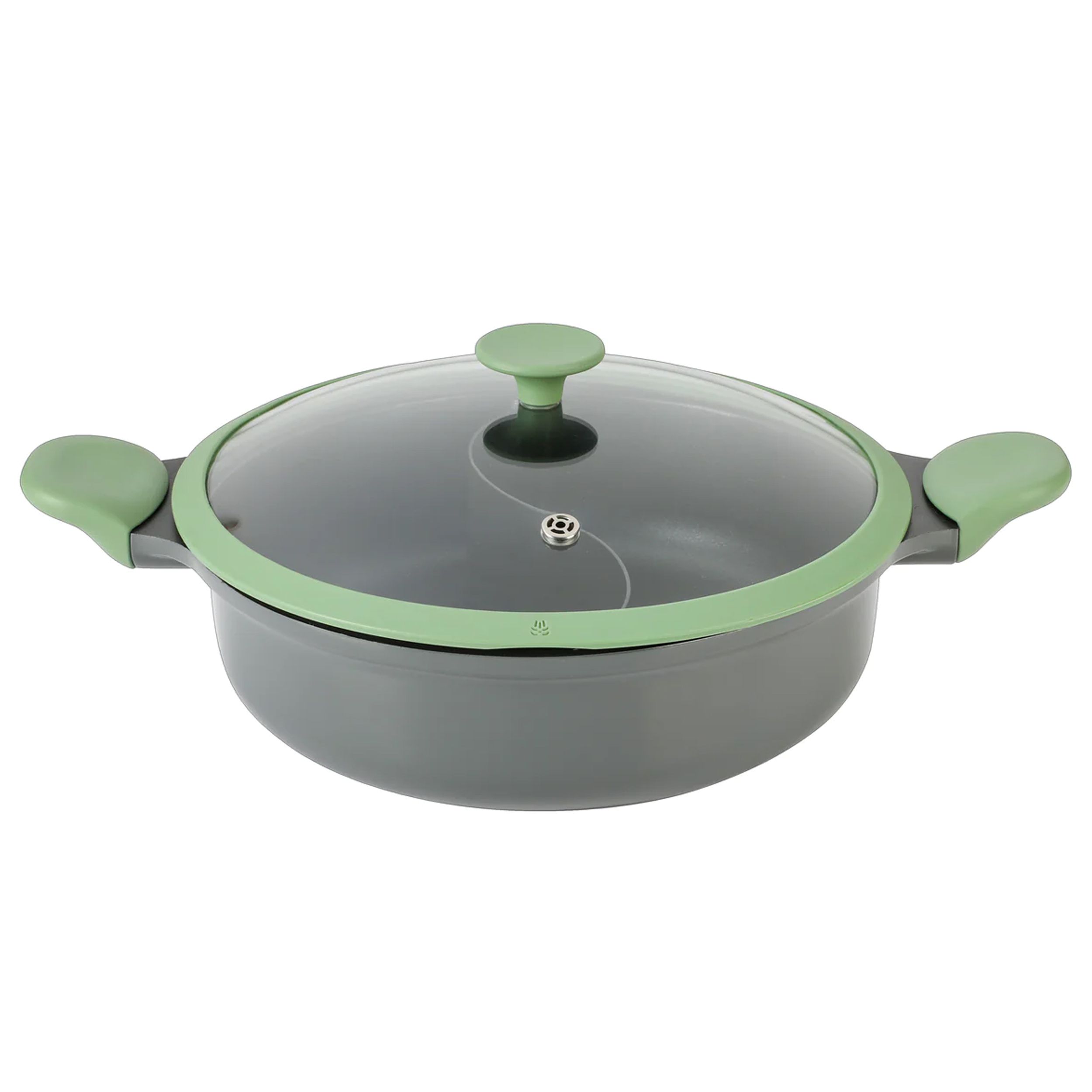 Set up a restaurant-quality hot pot experience at home with the Kenmore Theodore 6.5-quart Cast Aluminum Hot Pot with Divider and Lid. Made from heavy-gauge cast aluminum, this pot distributes heat evenly for optimal culinary results. Cook two side dishes or soup flavors simultaneously in the divided, nonstick interior to recreate your restaurant favorites to family and friends. Wide handles provide a safe grip when lifting from the kitchen to the table. Serve rich broths and delicious meals from any stovetop. This piece of cookware offers the flexibility to use with induction, gas, electric, and other radiant cooktops. It comes with a tempered glass lid to lock in heat and moisture. Complete a Japanese shabu-shabu or a Szechuan hot pot spread with this cast aluminum pot as a beautiful cooking and serving centerpiece. Hand wash recommended.