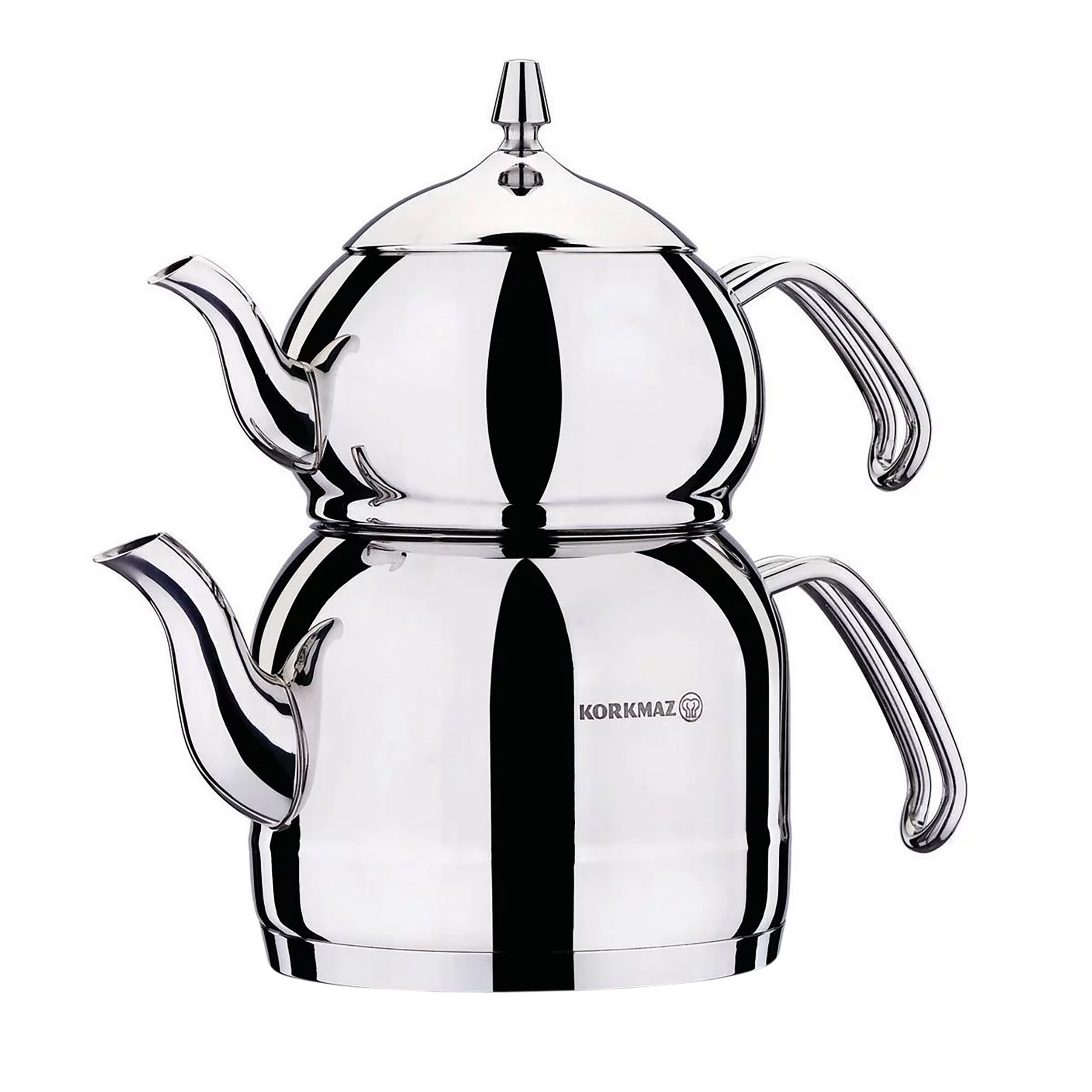 Manufacturer: Korkmaz UPC: 8691607002218 Model Number: A221 The Korkmaz Efendi Tea Pot and Kettle set provides you with a way to heat up water and tea from one source, saving energy and time. Kettle base has a heat transferring lid that helps to transfer heat to the kettle at the top efficiently and quickly. Stainless Steel construction is durable, lightweight, and long lasting while the handles remain cool to the touch for safety and ease of use. Thin necked pour spout on both kettle and teapot allow for precision pouring. Induction safe base and dishwasher safe design Weight: 6.00