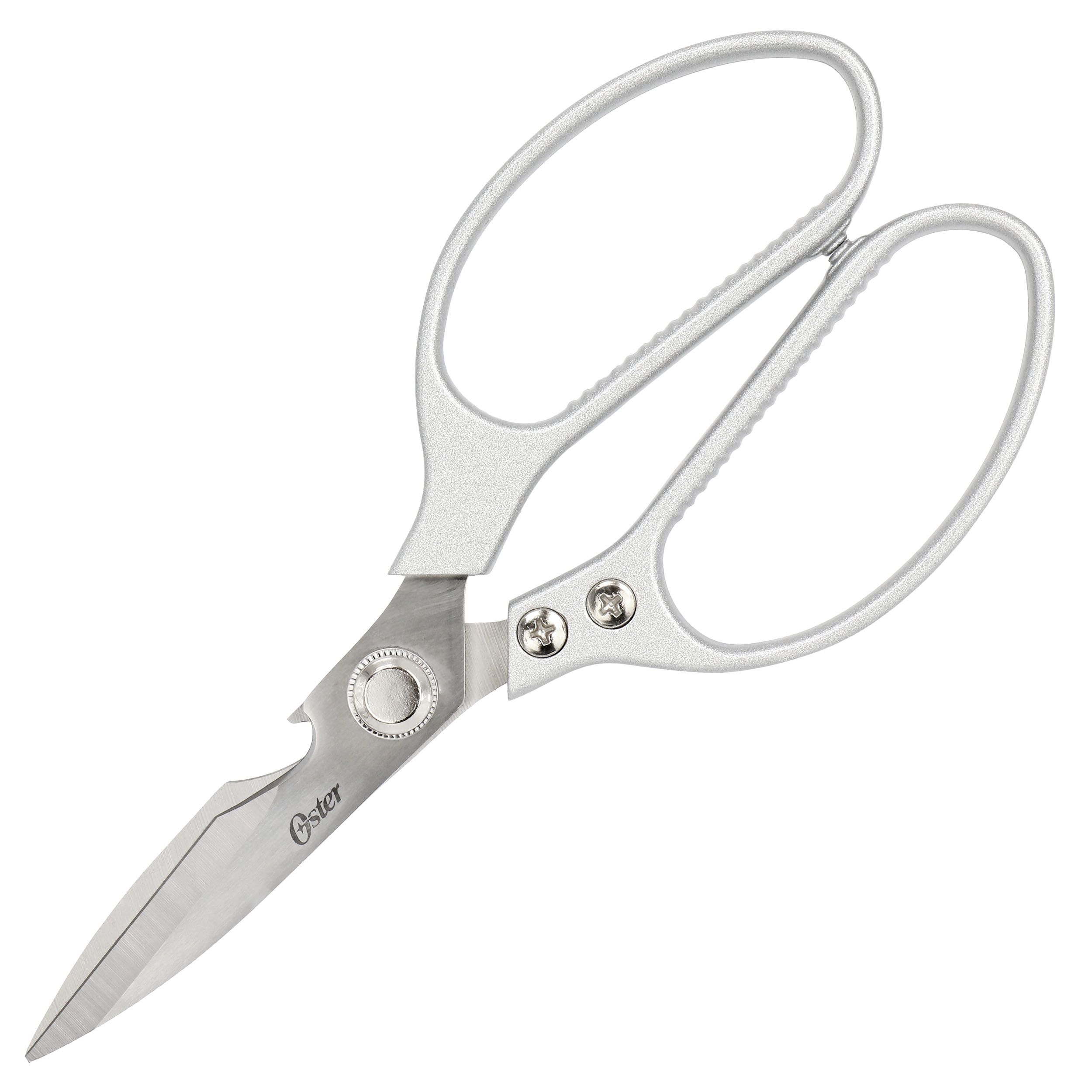 The Oster Baldwin 8.5in multi-purpose scissors are made with heavy-duty durable stainless steel that provides a strong grip and has better corrosion resistance for extended use. These sharp scissors can be used in the kitchen to cut meats and veggies, or can be used for every day household tasks. Ridged handles provide and sturdy non slip grip while the built in bottle opener comes in handy to grab and lift crowns caps.