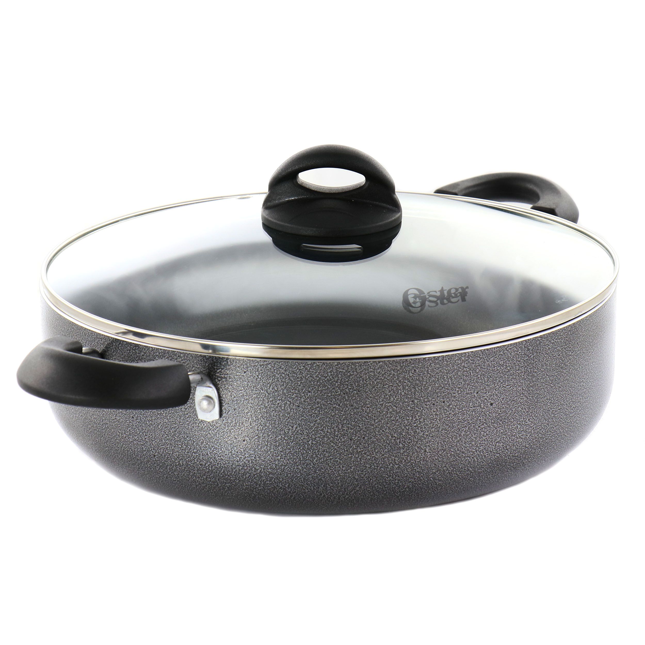 This Oster Claiborne 6 Qt. Nonstick Aluminum Everyday Pan in Grey makes a great addition to any kitchen with a nonstick interior for easy clean up, aluminum construction for even cooking, and vented tempered glass lid to keep an eye on your food as it cooks. It is recommended to hand wash this item and to not use steel wool or other harsh chemicals to keep the nonstick coating in prime condition.