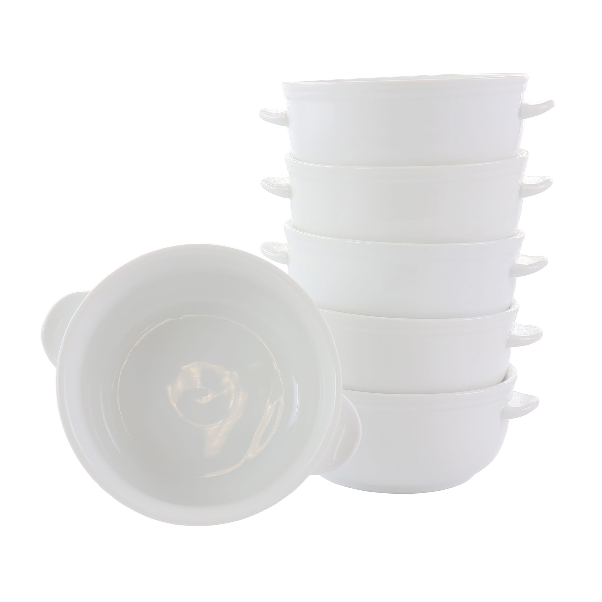 Enjoy a delicious dinner in these adorable Our Table Simply White 6 Piece 5.5 Inch Porcelain Double Handle Bistro Bowls. Made of durable porcelain, these sturdy dishes are dishwasher, microwave, and oven safe making them great for everyday use. The two handles at both sides offer the perfect grip for transporting these to and from the table. The sleek and clean glossy finish means these are sure to fit in beautifully with your existing kitchenware. These are just the right bowls for a fantastic batch of chili, or anything else your heart desires.