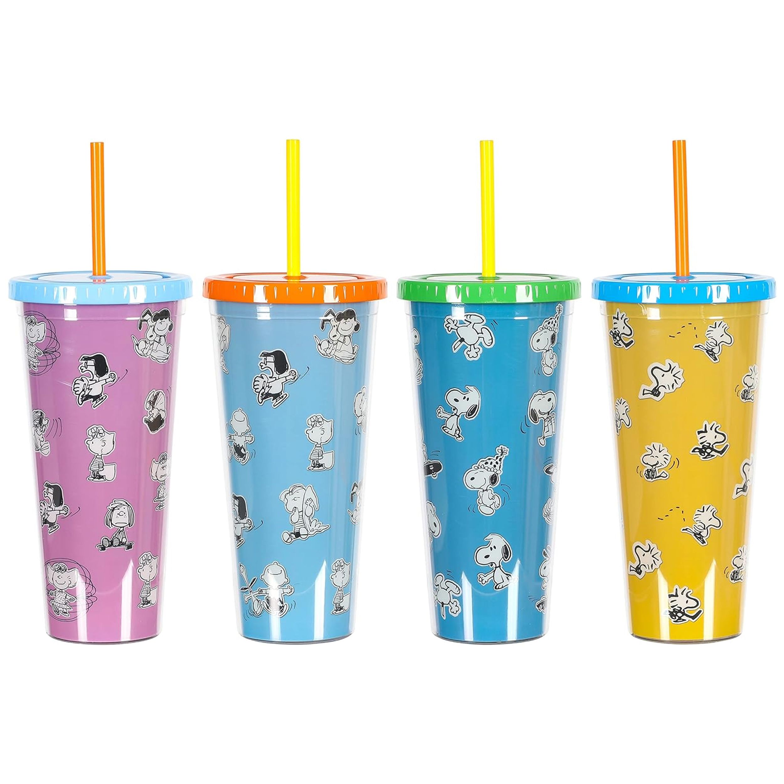 Celebrate the American classic Peanuts with the Gibson Peanuts 70th Anniversary 4 Piece Plastic 23.6oz Tumbler set with Lid and Straw in Assorted Colors. Features four different Snoopy inspired patterns in assorted colors. The BPA free plastic material is durably made to be shatter proof and ideal for on the go beverages. These travel cups are ideally made to suit most cup holders. Enjoy refreshing water at home, sweet juices out on the road, or bring along a soft drink to work.