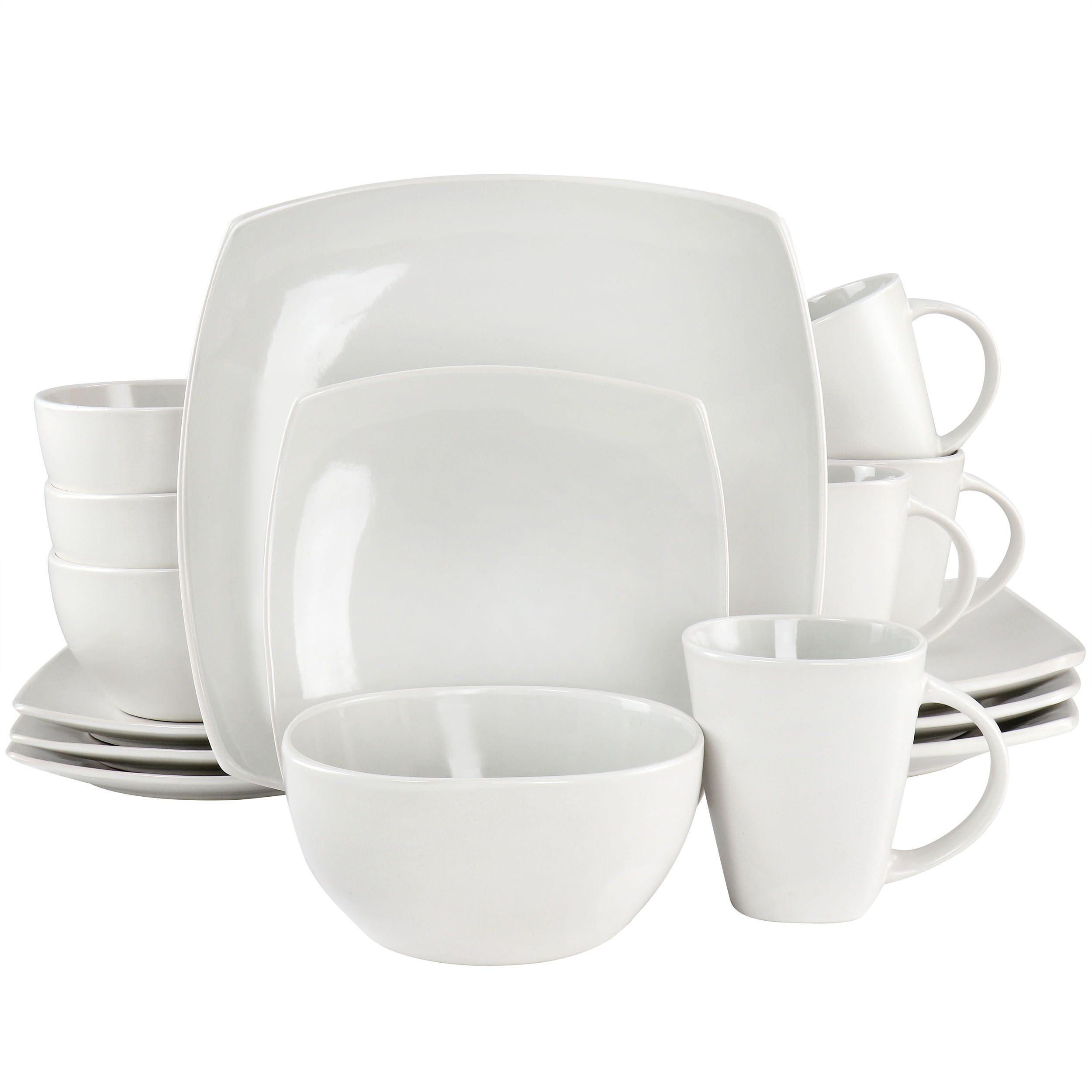 The Gibson Elite Sogo Lounge Bright Shell 16 Piece Dinnerware set is perfect for both fine dining and every day meals. This set is designed with a modern square shape and finished with a warm white color that will go with most home decor styles and motifs. Outer matte finish and inner gloss finish add a touch of style to this set. Constructed of durable stoneware, each dish is dishwasher and microwave safe for long lasting use and easy cleanup. Set up your dinner for success with the Soho Lounge Bright Shell Dinnerware set!